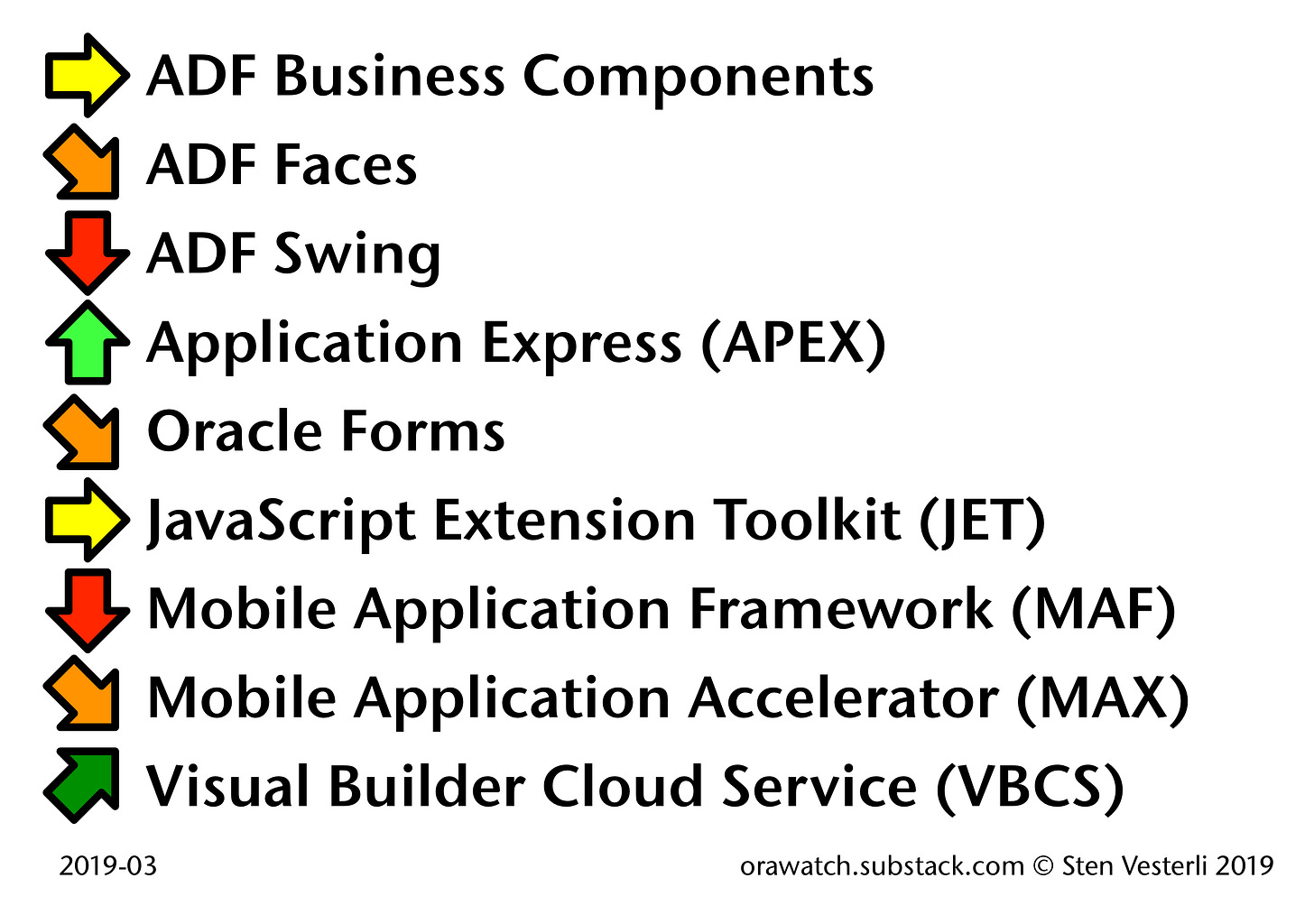 If you are responsible for Oracle strategy within your organization, your new Oracle development effort should focus on Oracle APEX and Visual Builder Cloud Service (VBCS). If you have applications built with other Oracle technologies like Forms and ADF, there is no urgent need to retire them. But do evaluate any new requirements to see if you should start transitioning to another tool.